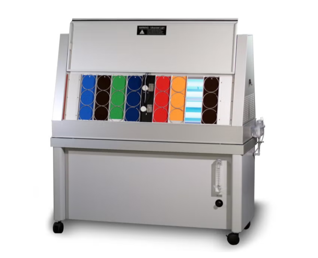 一些行业测试方法规定使用冷白色荧光灯进行室内光稳定性测试。为了重现这些室内光照条件,QUV/cw 使用普通冷白色荧光灯。它有一个 SOLAR EYE 辐照度控制系统,可以监测和控制可见光输出,而不是紫外线。