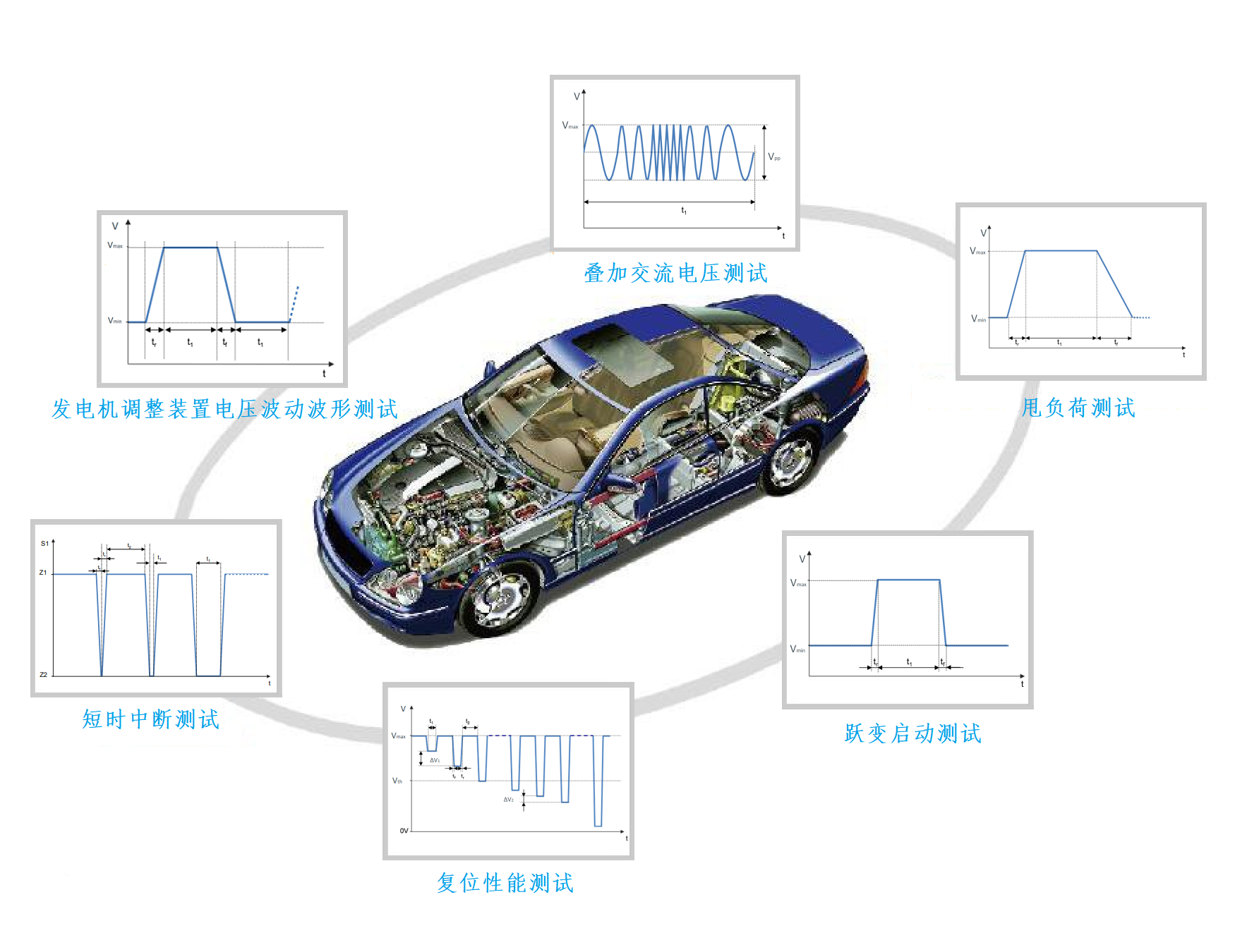 本测试系统可为各汽车公司制定的电性能测试标准要求提供灵活的解决方案,应用于检测汽车零部件的功能检验和可靠性能检验,可满足GMW 3172、VW 80000、LV 124等汽车企业标准的测试要求。