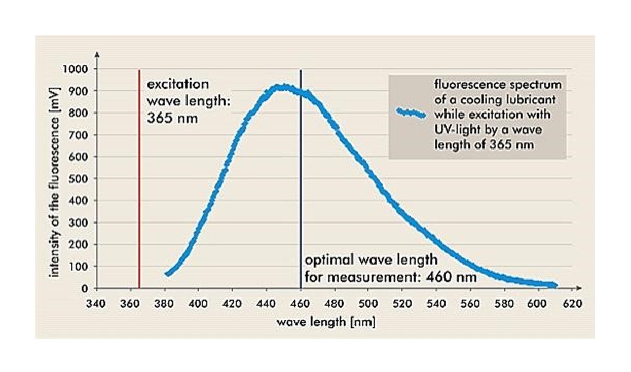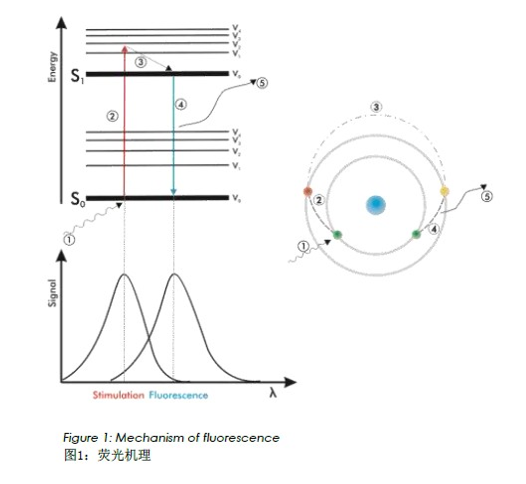 通俗来讲,紫外线激发荧光,当污染物电子吸收了光子后能量提高,形成电子云层跃迁,由低能级跃迁到高能级,但在高能级的状态是不稳定的,它回到起初的能级,并释放出能量。由于部分能量转化为热量消耗了,所以发射的光子能量降低,波长变长。